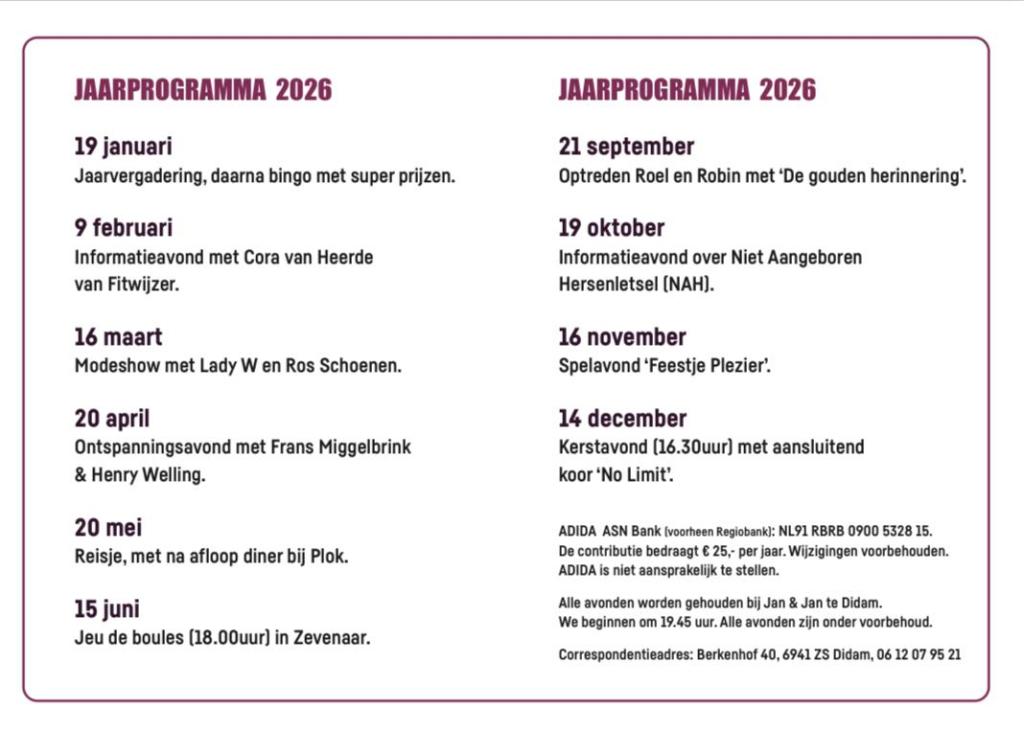 Jaarprogramma 2026 fietstocht op de eerste woensdag van de maand. deelname is vrijblijvend. Ook niet leden zijn van harte welkom.We vertrekken om 13:00 bij de Mariakerk in Didam.
